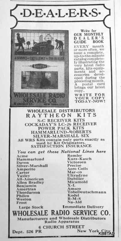 The following year, Wholesale Radio advertised an 80 page catalog in an ad in the April 1925 issue of Popular Radio followed by a 96 page catalog in October. The full page ad offered a complete set of parts for a superhet that Popular Radio's Technical Editor Lawrence Cockaday had designed and written up in the January 1925 issue as the Cockaday Improved DX Receiver. In addition to a kit of parts for that particular radio, Wholesale Radio Service also offered a fully-built version complete with tubes and a Korach tuned-loop antenna for $132.00, serious money in 1925. An equivalent value in 2012 dollars would be about $1700. That superhet was an exceptional performer in 1925. The ads for a complete set of parts or a custom-built version avoided the sticky issue of patent royalties. The superhet was a closely-held patent in the 1920s. Wholesale Radio placed more ads in subsequent issues of Popular Radio.
