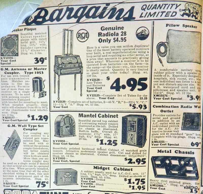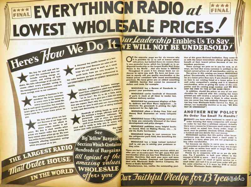 Wholesale Radio grew during the tough times. An ad in the New York SUN in November 1931 touts "Replacement parts of every description for all model receivers are available at lowest Wholesale prices." "Write for big Tenth Anniversary catalog." The 1932 catalog claims, "Our business runs into millions of dollars per year", quite a statement during the height of the Depression. A 1934 catalog notes that "12 years have passed through good times and bad times". During those years, some major radio manufacturers went under. Their excess inventory could of course be made available through catalog sales.