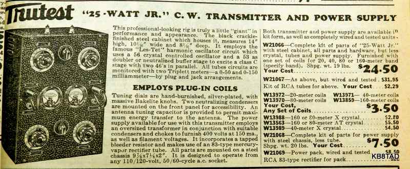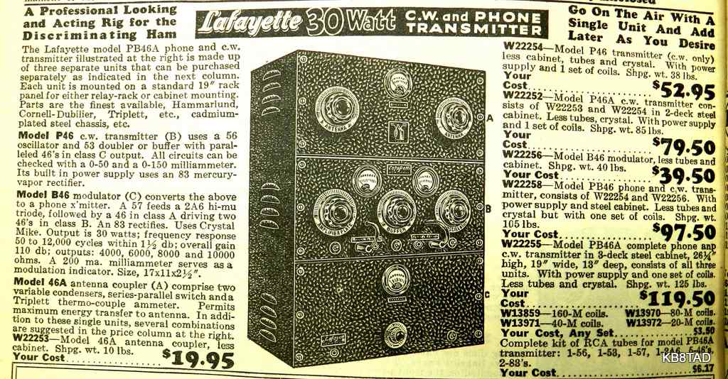 The 1937 catalog has a complete description of both the 25 watt Junior and the larger P46A, a handsome rack-mounted 30 watt output transmitter which sold for $52.95 plus cabinet, tubes and crystals. A matching modulator, the B46, was available for $39.50 plus tubes and an antenna tuner, model 46A sold for $19.95. The catalog notes that the transmitter is conservatively rated and was tested at higher outputs.