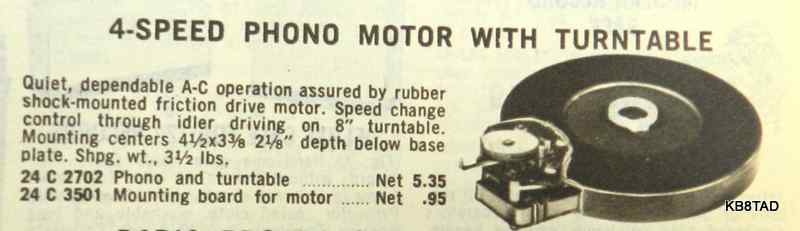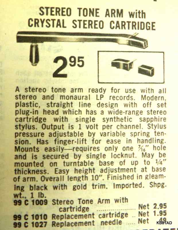 My first order was for a VOM meter (measuring volts, ohms, and milliamperes) for the price of $9.95 plus postage for shipping. It was Lafayette's Argonne brand that was made in Japan but worked very well. I followed up with an order for a small four-speed turntable with plywood mounting board, a radio-phono adapter switch, and the cheapest stereo tone arm offered by Lafayette, also Japanese-made, all so I could listen to records through an old Philco console I had repaired.