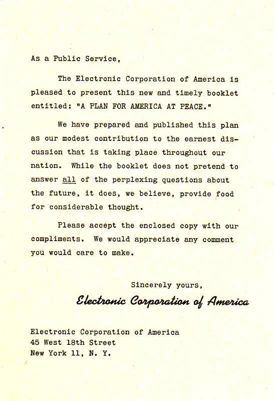The surprise, however, was Novick. In addition to his involvement with Lafayette, Novick had purchased the Transformer Corporation of America, changing its name to Electronic Corporation of America in 1942 with himself as President and his wife as Secretary. He also set up a couple of smaller companies as divisions. During World War II, Novick's Electronic Corporation of America had contracts with the US Navy for production of six million dollars worth of secret radar testing equipment. His company received an Army-Navy "E" award for production excellence. He had been honored at a dinner with 300 business and labor leaders in Chicago for his wartime contributions to harmonious labor-management relations and was presented with a scroll by the United Electrical Radio and Machine Workers Union. At the dinner he was cited as the author of "A Plan for America at Peace", a 40 page publication extolling the future with electronics through his company with all workers working in harmony for the common good. Speakers at the event were Chicago Mayor Edward Kelly and Marshall Field. (believed to be Marshal Field III, investment banker and publisher of the Chicago Sun Times.)
