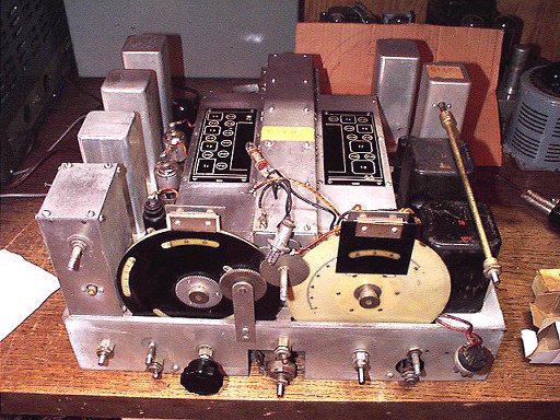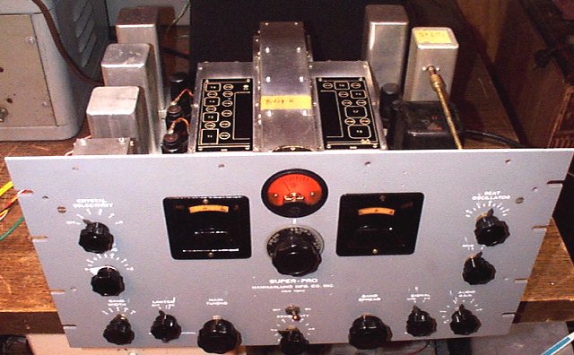 The power supply on the SP-200 is separate. It did not come with this set so I built one to provide the required 380 volts at 50 ma, 250 volts at 100 ma, 100 volts at 10 ma, -50 volts at 11 ma, and 6.3 volts AC at 7.5 amps. The power supply with its little rack cabinet is visible to the left.